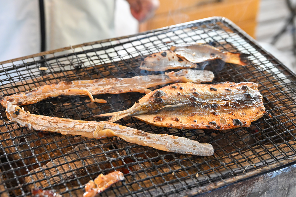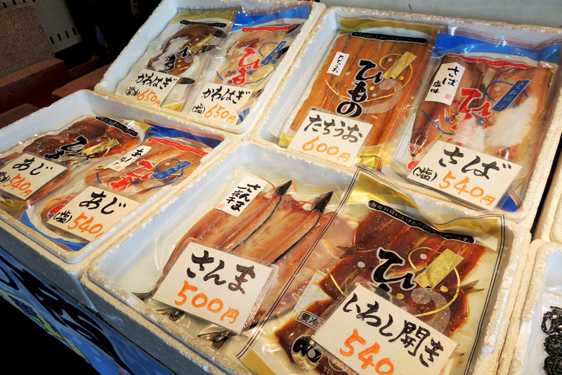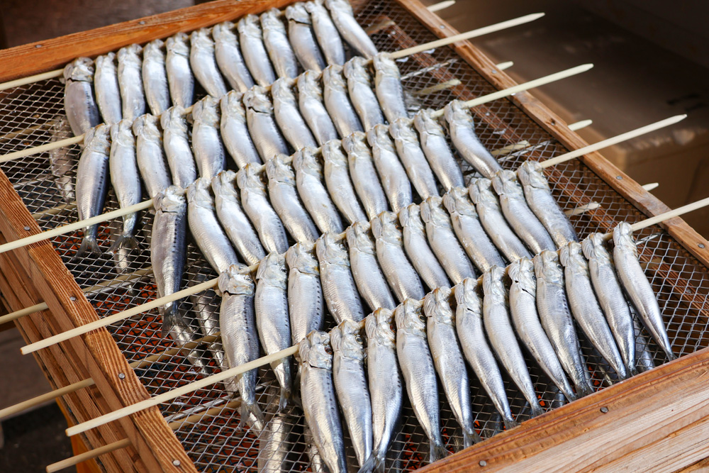 カマスにアジ、イカなど、ジューシーで美味しい干物が並んでいます!