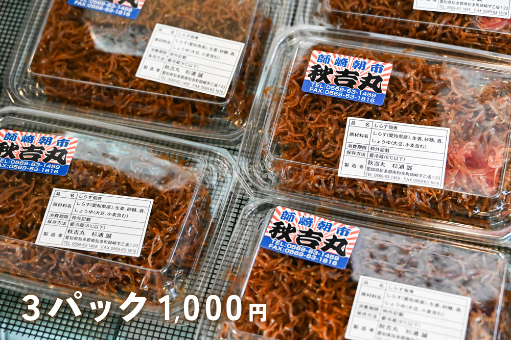 新鮮な魚が集う漁港で開催している『師崎漁港朝市』では、地元で水揚げされた魚介や干物・佃煮等の水産加工品を中心に、様々な商品を販売しています。