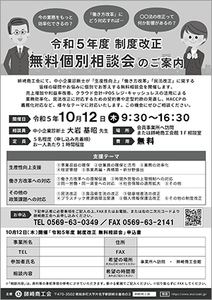 師崎商工会にて、中小企業診断士が「生産性向上」「働き方改革」「民法改正」に関する皆様の疑問やお悩みに個別でお答えする無料相談会を開催します。