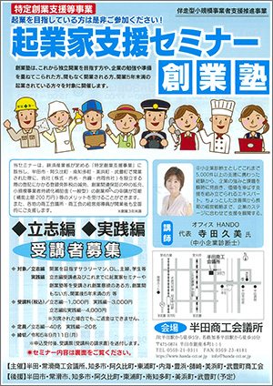 当セミナーは、経済産業省が定める「特定創業支援等事業」に該当し、半田市・阿久比町・南知多町・美浜町・武豊町で開業された際に、会社(株式・合名・合資・合同会社)を設立する際の登記にかかる登録免許税の減免、創業関連保証の枠の拡充、小規模事業者持続化補助金(一般型)の創業枠への申請が可能(補助上限200万円)等のメリットを受けることができます。