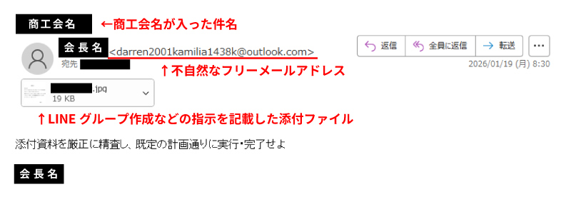 この度、愛知県を含む全国の商工会連合会や、商工会の会長等になりすまし、「LINEのワークグループ作成を促す指示のメール」や「個人情報を取得するため返信を促すような内容のメール」等が全国的に出回っております。