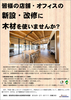 愛知県では、民間建築物等の木造・木質化を促進するため、以下の取り組みをしています。