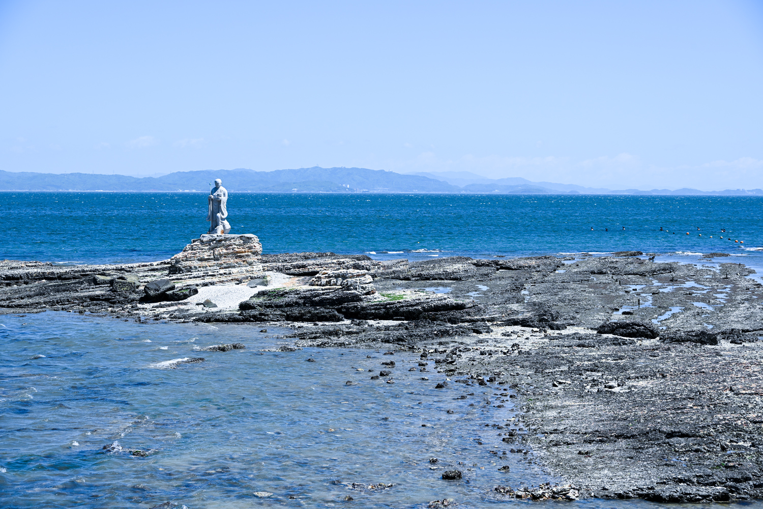 海上の双子岩に建つ「上陸大師」像は、弘法大師ゆかりのパワースポットであり、聖崎公園のシンボルです。